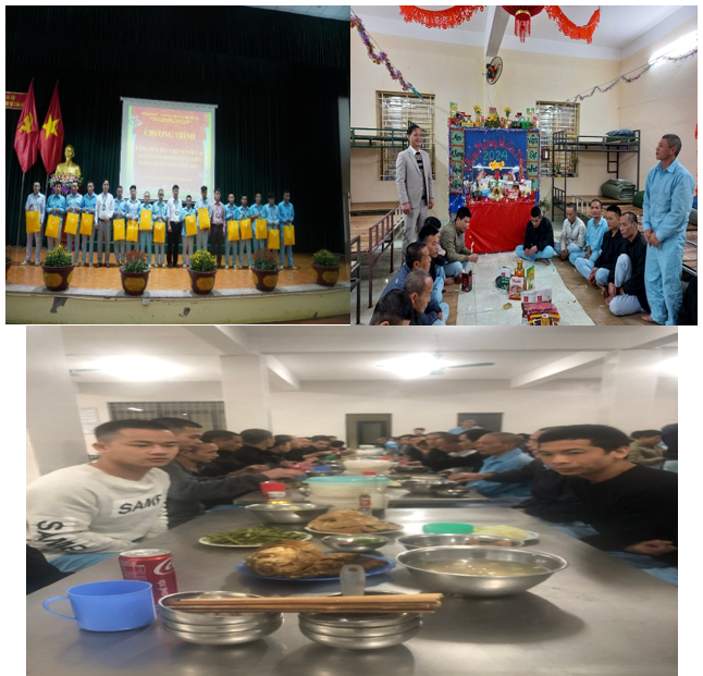 Đơn vị thực hiện đúng, đầy đủ chế độ, chính sách và tiêu chuẩn trong các ngày Lễ, Tết. Các bữa ăn của người cai nghiện có đầy đủ hương vị của ngày Tết cổ truyền như giò, thịt gà, bánh chưng, dưa hành,… đảm bảo vệ sinh an toàn thực phẩm, phòng chống dịch bệnh. Ban Giám đốc đơn vị quan tâm, thăm hỏi, tặng 30 suất quà cho số người cai nghiện không có gia đình đến thăm gặp, có hoàn cảnh khó khăn; tổ chức các đoàn cán bộ đến từng buồng ở của người cai nghiện chúc Tết đêm giao thừa; tổ chức cho 72 người cai nghiện tiêu biểu được gọi điện qua zalo chúc Tết gia đình. Những hoạt động này nhằm động viên, khích lệ, giúp người cai nghiện cảm nhận sự quan tâm, đồng hành và tình yêu thương ấm áp mà Đảng, Nhà nước, các cấp ngành và Ban giám đốc Cơ sở dành cho họ. Đây sẽ là một niềm vui, một nguồn động lực mạnh mẽ để người cai nghiện tiếp tục cố gắng hơn nữa trong học tập và rèn luyện; đặc họ sẽ cảm thấy Tết thêm yêu thương, đong đầy và ý nghĩa.