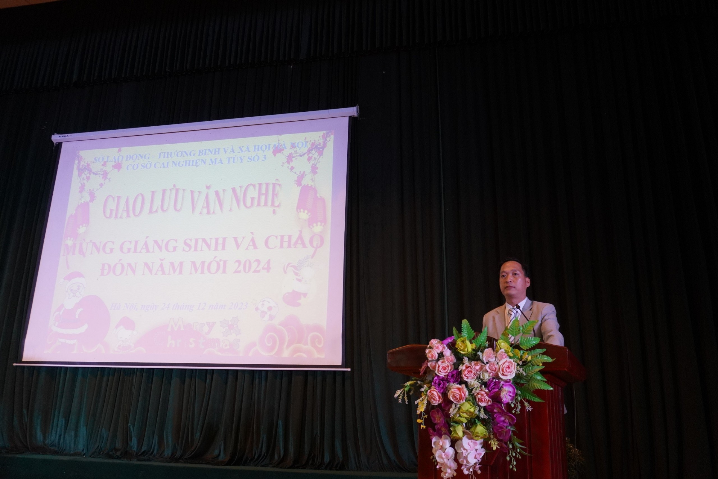 Sáng ngày 24/12/2023 Cơ sở Cai nghiện ma túy số 3 Hà Nội tổ chức chương trình giao lưu văn nghệ và trò chơi có thưởng mừng Giáng sinh và chào đón năm mới 2024. Tham dự chương trình có đồng chí Đỗ Văn Yên - Trưởng thôn Xuân Đồng, các đồng chí đại diện cho chính quyền và các đoàn thể thôn Xuân Đồng - Tân Minh; đồng chí Ngô Văn Ất - Bí thư Đảng ủy, Giám đốc Cơ sở; các đồng chí trong Cấp ủy, Ban Giám đốc cùng toàn thể cán bộ và người cai nghiện tại Cơ sở.