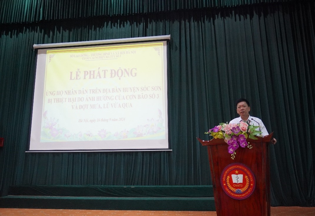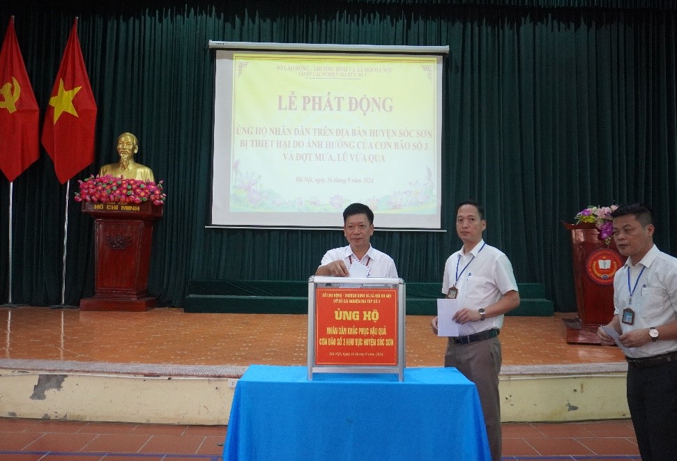 Nhằm phát huy tinh thần đoàn kết, tương thân tương ái, một trái tim – một tấm lòng; với tinh thần “nhường cơm sẻ áo”, người có của góp của, người có công góp công, có ít góp ít, có nhiều góp nhiều; Thực hiện kế hoạch số 3473/SLĐTBXH-VP ngày 12/9/2024 về việc ủng hộ đồng bào vùng bão, lũ, khắc phục hậu quả do cơn bão số 3 Sở Lao động- Thương binh và Xã hội Hà Nội đã huy động toàn bộ công chức, viên chức, người lao động trong toàn ngành mỗi người đóng góp ít nhất một ngày lương; Cơ sở Cai nghiện ma túy số 3 Hà Nội đã quyên góp được số tiền là 28.735.000 đồng. Ngày 16/9/2024 Cơ sở Cai nghiện ma túy số 3 Hà Nội tổ chức Lế phát động ủng hộ đồng bào bị ảnh hưởng bởi cơn bão số 3 nói chung và nhân dân trên địa bàn huyện sóc sơn nói riêng. Tham dự Lễ phát động có đồng chí Ngô Văn Ất, Bí thư Đảng ủy, Giám đốc Cơ sở, các đồng chí trong Cấp ủy, Ban Giám đốc cùng toàn thể công chức, viên chức, người lao động của đơn vị.